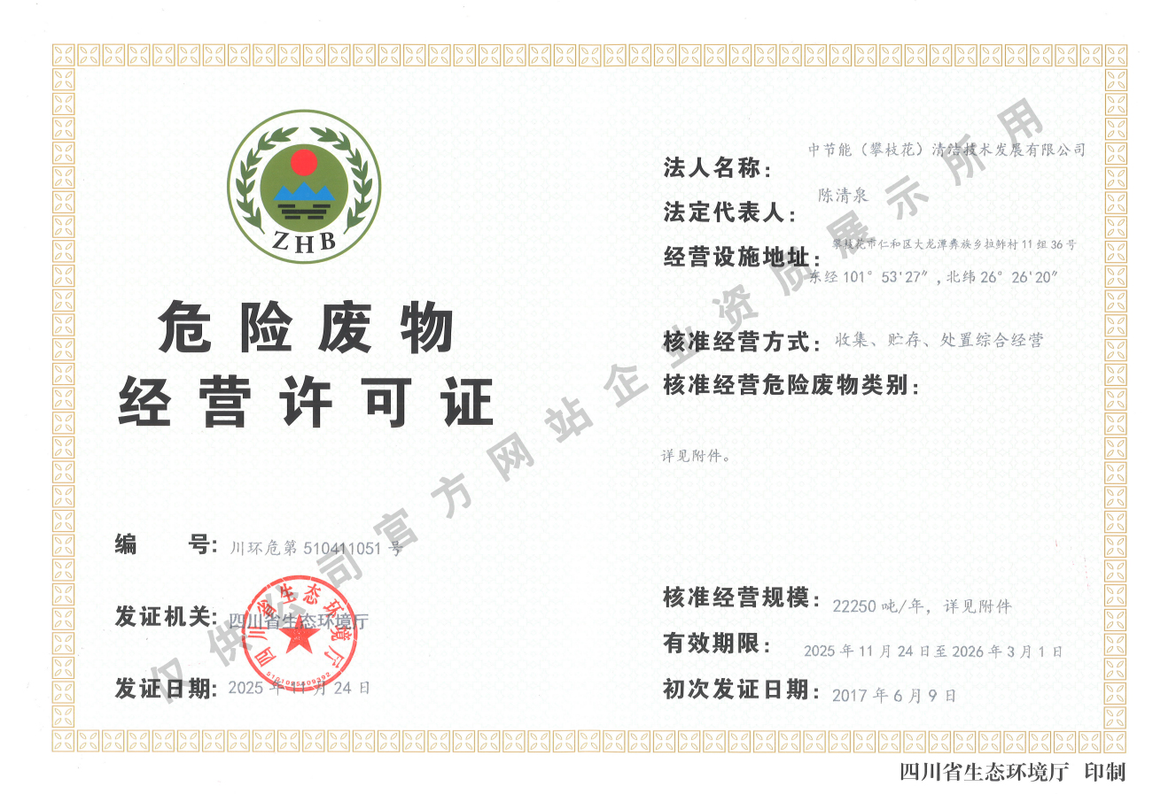 中节能(攀枝花)清洁技术发展有限公司(以下简称公司)成立于2008年5月,注册资金1.6519亿元。公司由中节能清洁技术发展有限公司和攀枝花市产业投资经营有限责任公司共同持股,并由中节能清洁技术发展有限公司控股经营。公司投资建设和运营的攀枝花市危险废物处置中心项目是全国统筹部署的全国31个危险废物综合处置中心项目之一,位于攀枝花市仁和区大龙潭乡迤资村华卖社,核准处理原生废物2.425万吨/年,可对43大类,447项(医疗废物)进行安全处置。